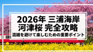 2026年度の三浦海岸の河津桜の混雑状況について、2月の見頃や駐車場予約、ランチの待ち時間対策を徹底解説します。現在の三浦海岸の河津桜の混雑状況をライブカメラで把握しつつ、京急の減速運転や渋滞回避のコツを知ることで、人混みを避けて絶景を楽しむための具体的な方法がわかります。