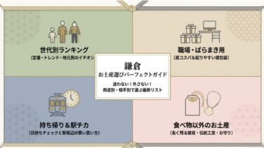 失敗しない鎌倉のお土産選びにお悩みですか?定番の鳩サブレーからSNS映えする最新スイーツ、ばらまきに便利な個包装や日持ちするお菓子まで、世代別ランキングを大公開!食べ物以外で喜ばれる可愛い雑貨や特別なお守りなど、鎌倉のお土産で絶対に外さない最新情報をたっぷりとご紹介します。